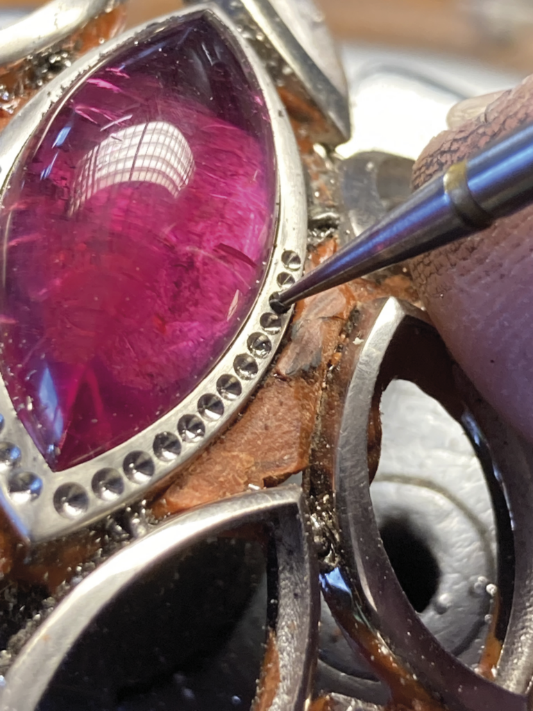 36 Stunden Design-Prozess, 118 Stunden Handarbeit, 25 unbehandelte Turmaline & 116 Diamanten, welche von Hand eingesetzt / gefasst wurden. Wir verschaffen Ihnen einen kleinen Einblick in die verschiedenen Arbeitsschritte für die Fertigung des Schmuckstückes: