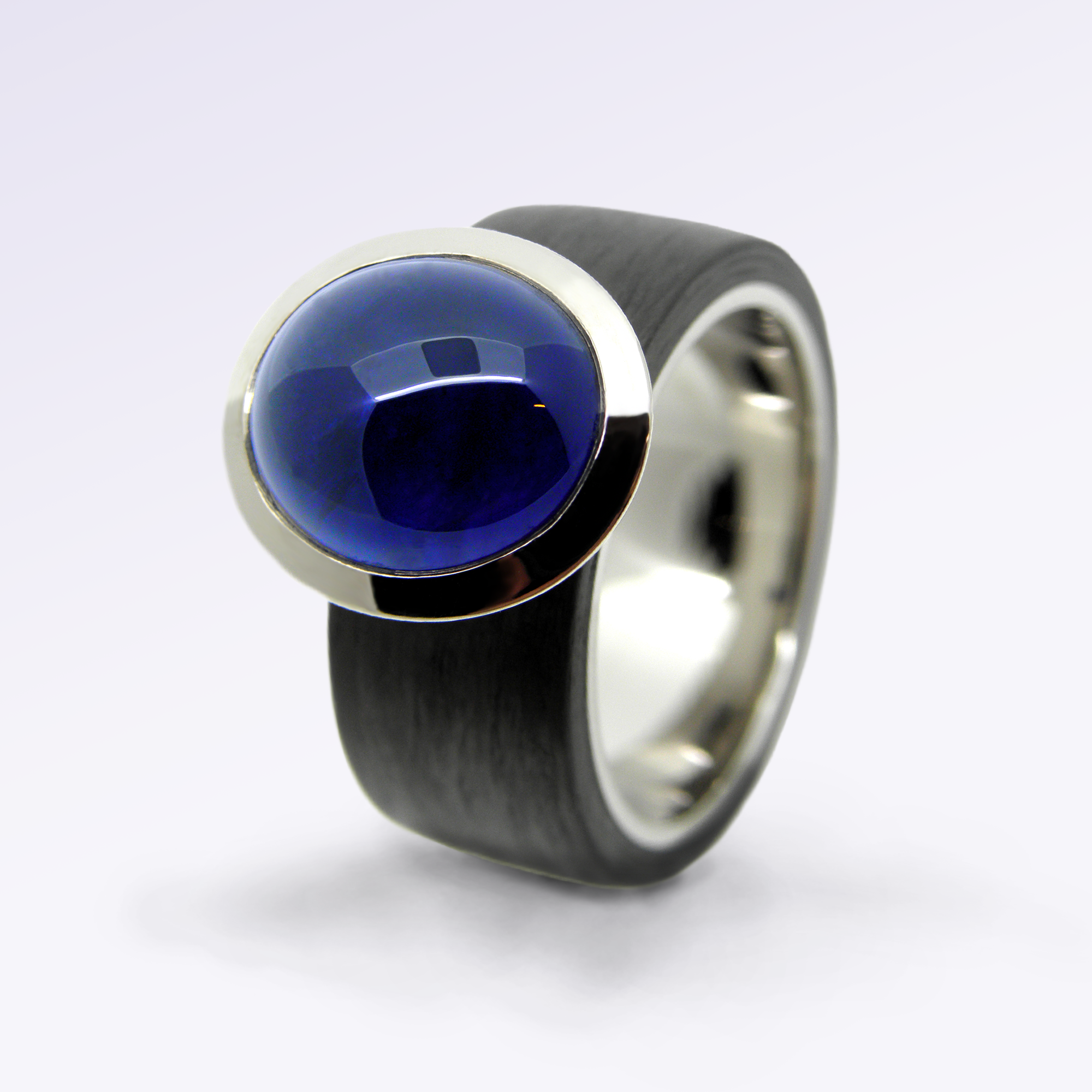 Moderner Damenring aus Carbon und Weissgold mit einem blauen Saphir im Cabochon Schliff in geschlossener Fassung.