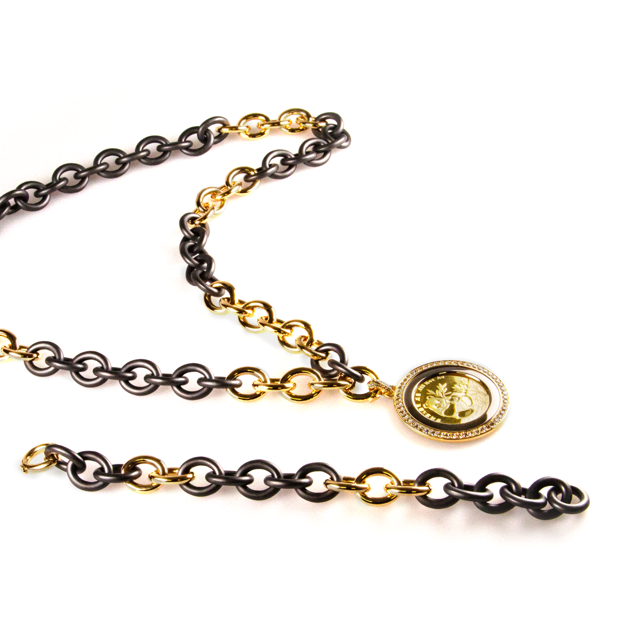 Individueller Unikat Schmuck in Gelbgold und Keramik, bestehend aus kombinierbarem Halsschmuck und Armschmuck. Anhänger mit drehbarem Mittel-Element aus braunen Diamanten und einer persönlichen Gold-Münze.