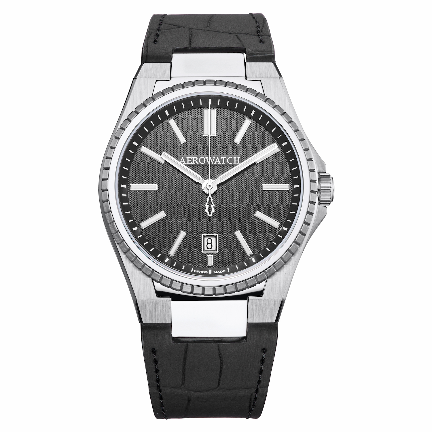 Sportliche Herrenarmbanduhr aus der Serie MILAN von Aerowatch. Elegantes Zifferblatt mit guillochiertem Tannen-Dekor. Erhältlich mit Automatik- oder Quarz-Werk.