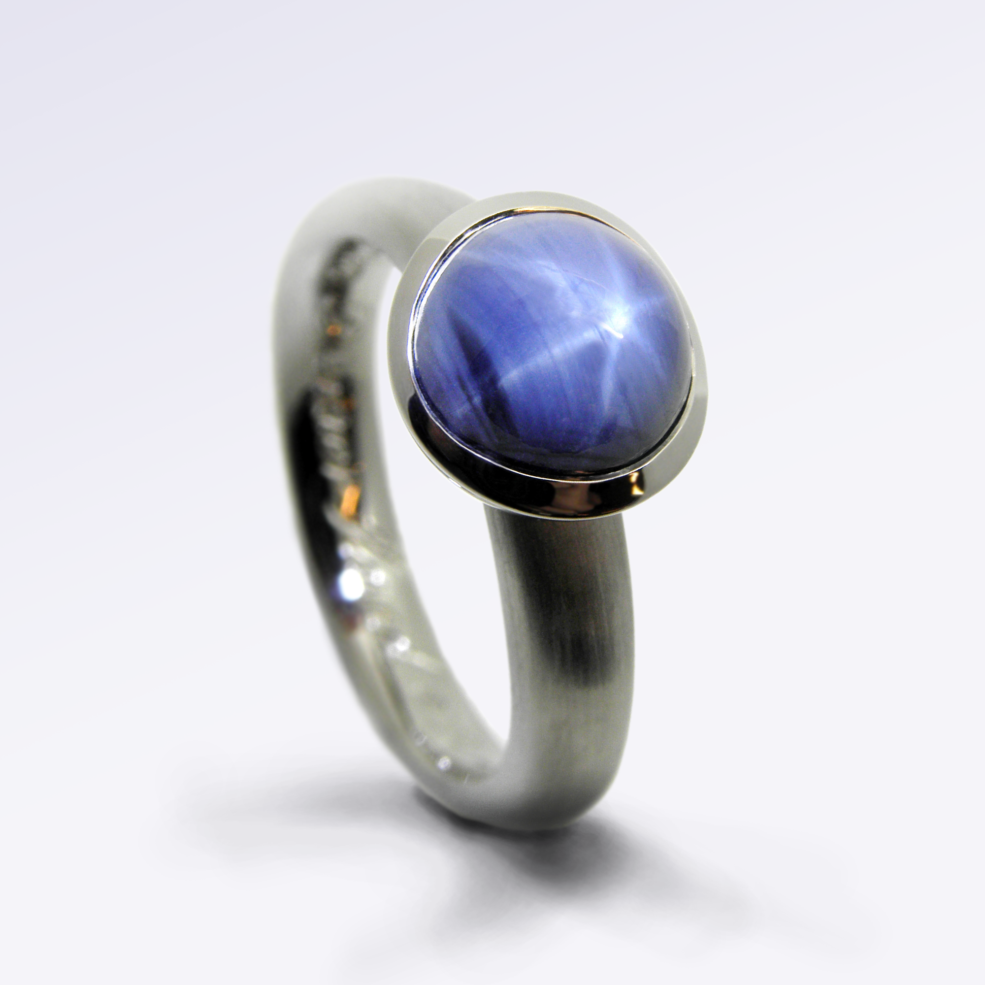 Damenring aus Weissgold mit geschwungener Ringform. Geschlossene Schüsselfassung mit blauem Sternsaphir.
